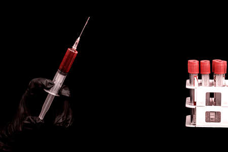 The hand in red rubber glove holds several syringes on a black background. Copy space. The concept of vaccination.