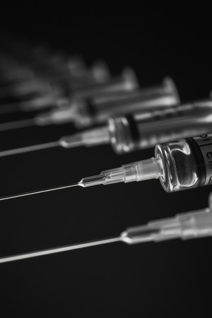 Close-up, Shallow Depth of Field, Row of Medical Syringes With Needles, Black and White