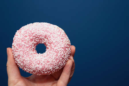 Hand holding a delicious colorful pink donut with sprinkles near dark blue background, sugar concept