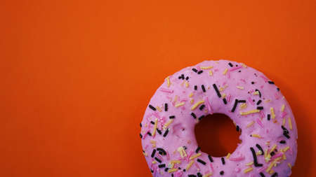 Sweet pink donut on orange background - place for text