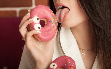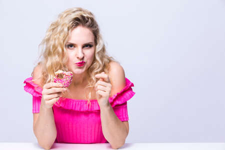 Beautiful seductive attractive sensual young woman eating sweet pink tasty donut over pink background