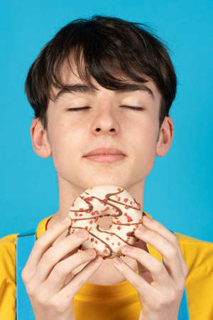 Teenager boy smelling sweet bun and resisting temptation.