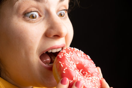 A woman bites a large red donut, a black background, a place for text. Gluttony, overeating and sugar addict.