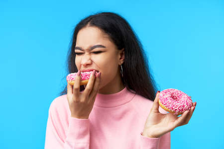 Hungry pretty girl eating donuts isolated over blue background