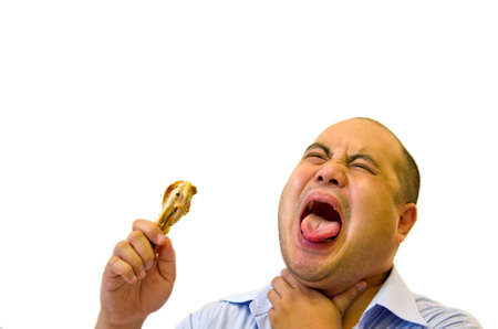 Young Funny Fat Asian man eating chocolate donuts isolated on white background, Unhealthy concept.