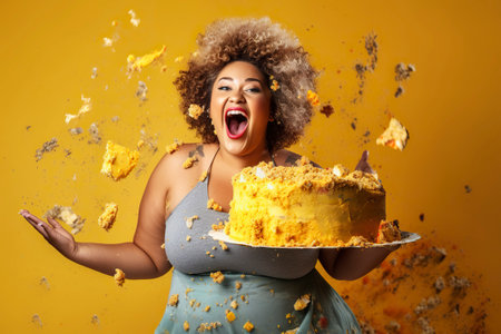 The irresistible allure of a sweet cake is hard to resist, but the woman exercises willpower to avoid getting fat. Ai generated.