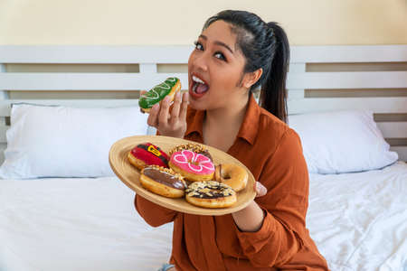 Unhealthy eating concept. Overweight fat woman holding plate with doughnut and eating while sitting on the bed at home. Plus-size fatty girl from sweet donut and bad junk food.