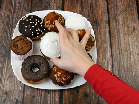 Big plate with sweets - different colorful round glazed donuts, bun with chocolate, cream, cakes and hand takes one on gray background, sweet tooth concept