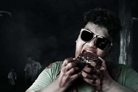 A scary zombie with blood and wound on his body eat the raw meat with dark background