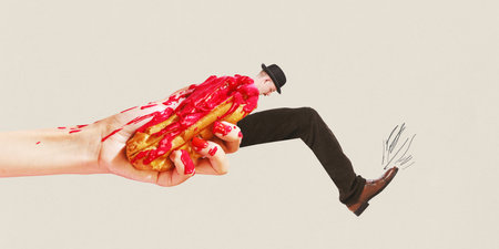 Poster. Contemporary art collage. Hand holding eclair with males body with want to running of it against beige background. Concept of traditions and culture, cuisine, journey and adventures.