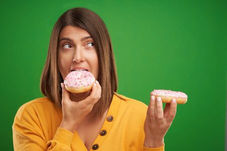 Beautiful woman posing with donuts over green background