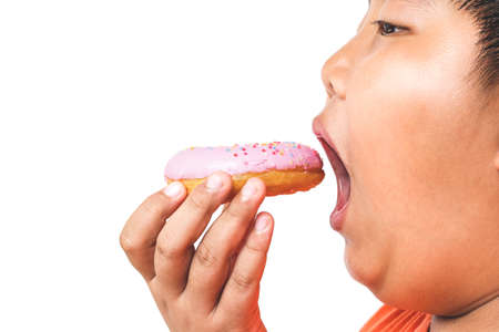 Asian fat boy holds a strawberry-coated donut He enjoys eating. Food concepts that cause children's physical health problems cause diseases. White background. isolated