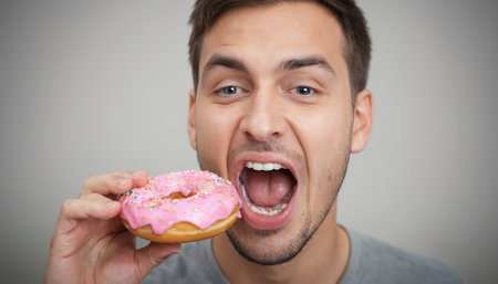 close up of young man eating donut ,