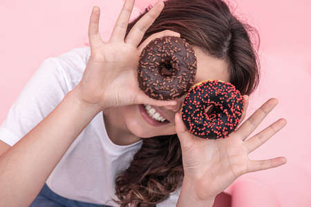 Happy young woman with donuts in her hands smile, holds pink donuts near her eyes her hands, pink background.