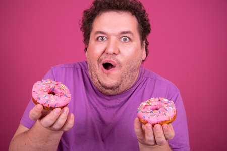 Portrait of funny fat man eating donuts and looking at camera isolated on pink background
