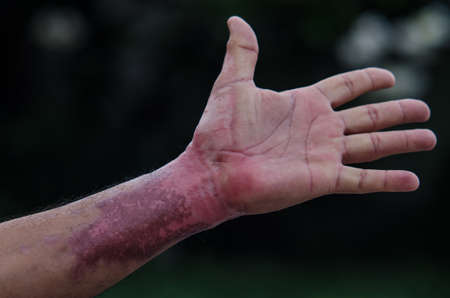 Red wound on the palm, arm, wrist after a burn or fall. First aid in wound treatment. Treatment of wounds