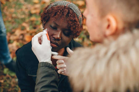 Two friends help a wounded boy in a autumn park