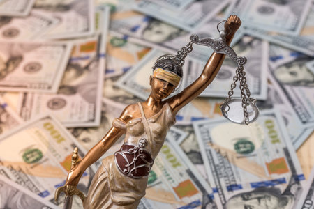 Themis statue standing against the background of dollars