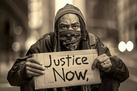 A man wearing a bandana and holding a cardboard sign that reads Justice Now stands on a city street.