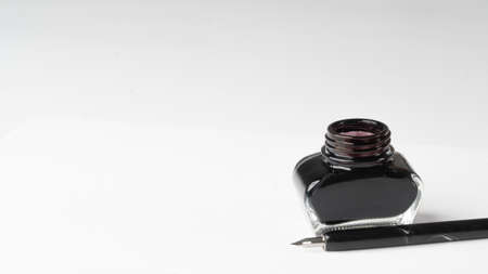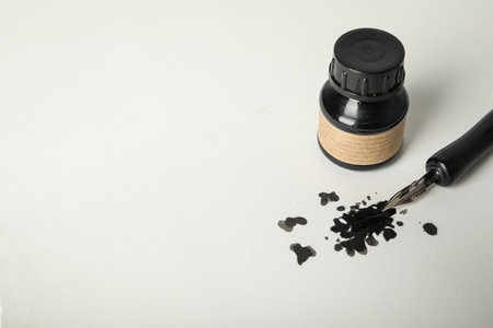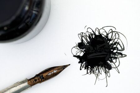 Ink blot, pen on white background, side view. Calligraphy concept, pen writing, spilled ink stains, brush, and writing training
