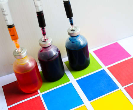 Bottle of ink printer has three colors. Colors is red, yellow and blue with syringe on colored paper.