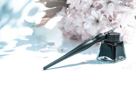 Old ink pen and ink bottle on white background. Vintage calligraphy pen and bottle of ink. Selective focus. Tender pink flowers in the background. Cherry blossom twig with black ink