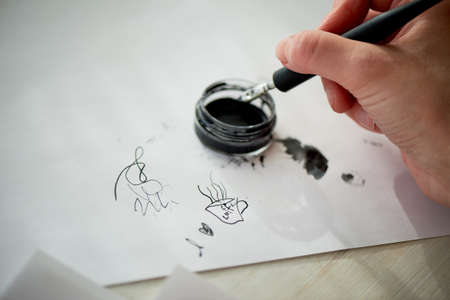 Artist's desk and workspace. Paper, ink and calligraphy pens. Creative process, lettering art workshop details with copyspace.