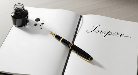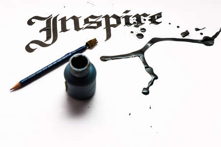 Inspire concept with fountain pen and ink bottle on white book. Creative design inspiration concept. Handwritten word motivate and write.