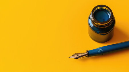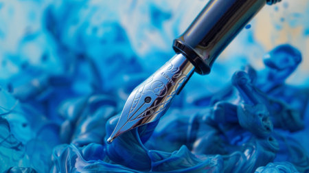 An artistic shot of a vintage fountain pen with the nib delicately dipped in a pool of vibrant blue ink capturing the beauty and artistry of the writing instrument