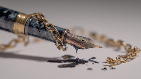 A close-up shot of a dripping ink pen resting on a chain, conveying themes of creativity and confinement in a striking black and white composition.