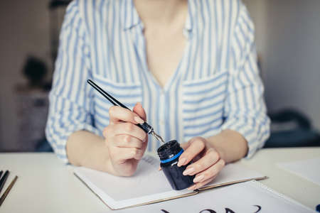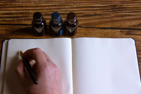 A womans hand writes with ink, a fountain pen. Writing. The creative process of creating a work