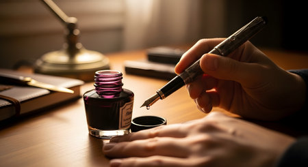 An author or calligrapher is captured dipping the nib of a vintage fountain pen into an open bottle of rich, purple ink. A single drop of ink hangs from the nib, ready to be put to paper. The scene, set on a wooden desk with a notebook and lamp, evokes the timeless and deliberate art of traditional writing.