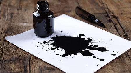 A close-up captures a fountain pen next to an inkwell, with black ink spilled onto a textured paper surface. The composition uses shallow depth of field, highlighting the pen's nib and ink drops. Ideal for illustrative uses within writing, creativity, or artistic concepts. Suitable for editorial and commercial publications.