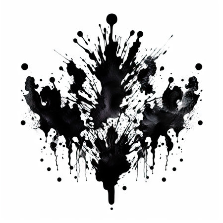 Black Messy Creative Ink Splatters Blots and Blobs and Inkblot Close Up on White Background