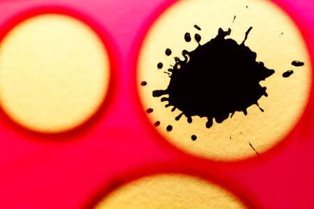 Abstract background with black watercolor blot. Pink background with yellow circles and black spot. Black drop with splashes.