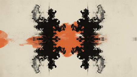 An abstract inkblot pattern symmetrically arranged, featuring a striking central red splash against a monochromatic background.