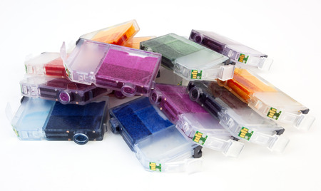 A jumbled stack of empty inkjet printer cartridges on a white background