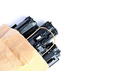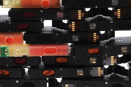 Toner cartridge set for color laser printer. Microcircuits. Equipment for printingon white background.