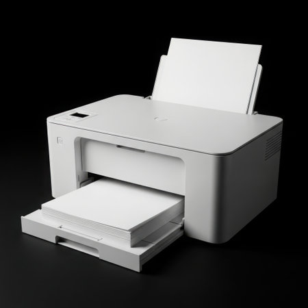 A white inkjet printer is shown with paper in the input tray and output tray against a dark background.