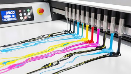 An inkjet printer dispenses multiple colors of ink onto a surface. The image showcases the process of color separation and printing. The composition features a close-up perspective, highlighting the flow of ink. It uses bright and saturated colors, suggesting potential use in advertising or illustrative projects.