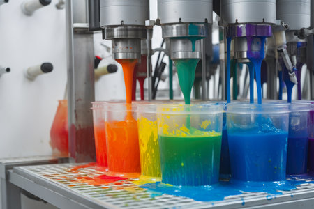 High-speed homogenizer blending colorful paint pigments with precision in a laboratory setting