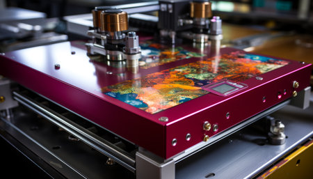Vibrant steel machinery illuminated in multi colored glowing heat generated by artificial intelligence