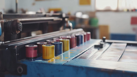 A close-up view of a vintage printing press featuring vibrant ink rollers. This image highlights the artistry and craftsmanship found in traditional printing processes.
