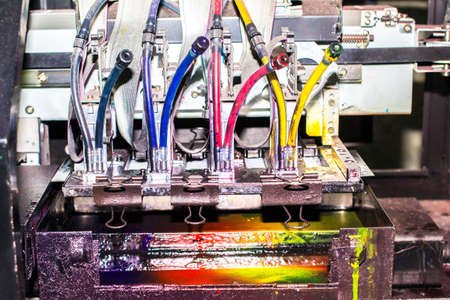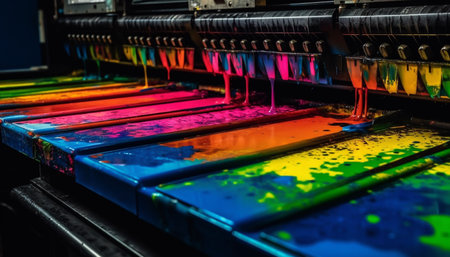 Close up view of an industrial printer head depositing vibrant colorful ink onto a surface, illustrating modern printing technology and precision manufacturing.