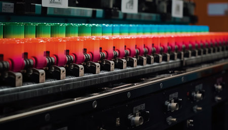 Modern textile factory uses automated equipment for colorful clothing production generated by artificial intelligence