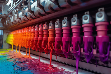 An inkjet printer dispenses multiple colors of ink onto a surface. The image showcases the process of color separation and printing. The composition features a close-up perspective, highlighting the flow of ink. It uses bright and saturated colors, suggesting potential use in advertising or illustrative projects.