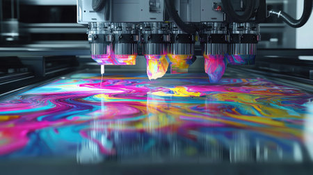 High-tech printing machines create vibrant abstract patterns with colorful swirls on a glossy surface, showcasing modern design and artistic innovation in a creative studio setting.