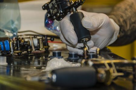 Tattoo machine and black paint are on the table in the tattoo salon.