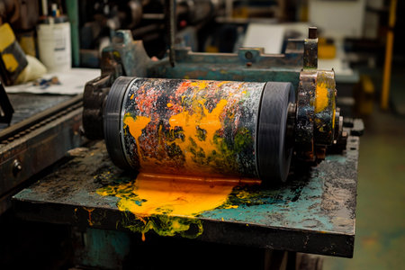 A vibrant cascade of orange paint flows from a large roller in a bustling printing workshop. Tools and materials surround this dynamic display of color, showing the artistry of printmaking.