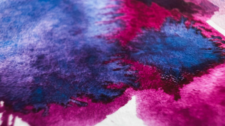 Bright abstract background colors pink purple violet blue. Macro wallpaper with watercolor stains. Aquarelle on paper close-up. Burst of color. Soft focus. Film grain pixel texture.